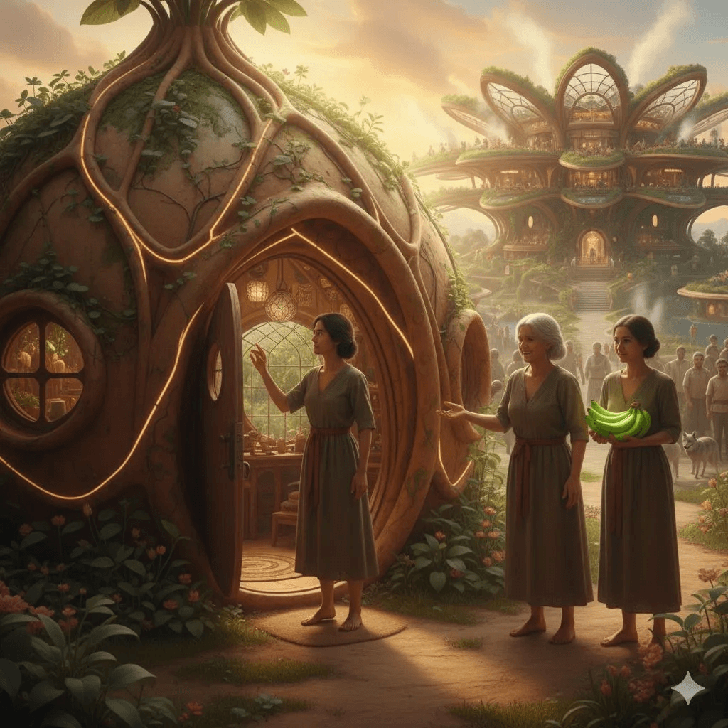 Warm, architectural, and deeply healing. This piece shows the actual blueprint of trust: walls that listen, roofs that catch sunlight like open palms, and a civilization that finally learned to live lightly, joyfully, and freely.