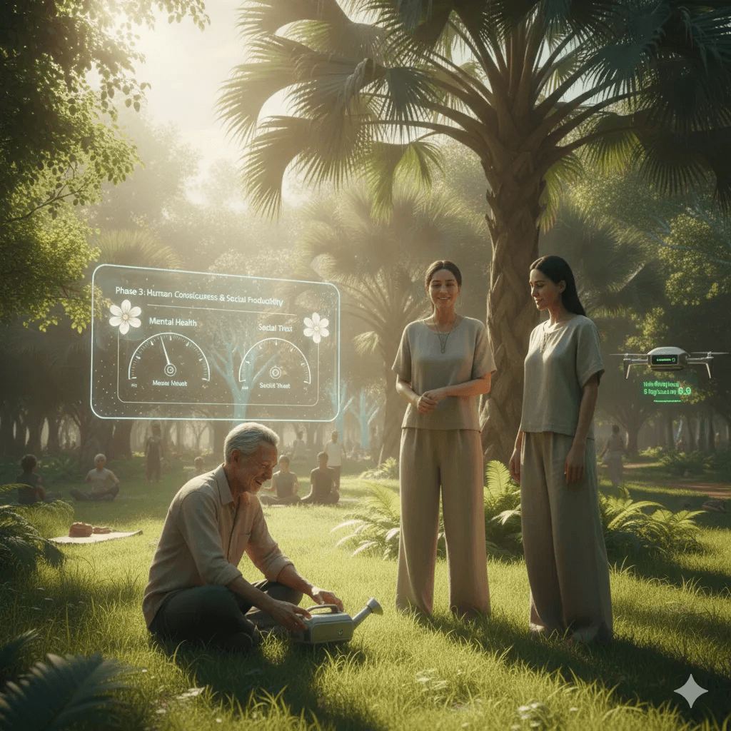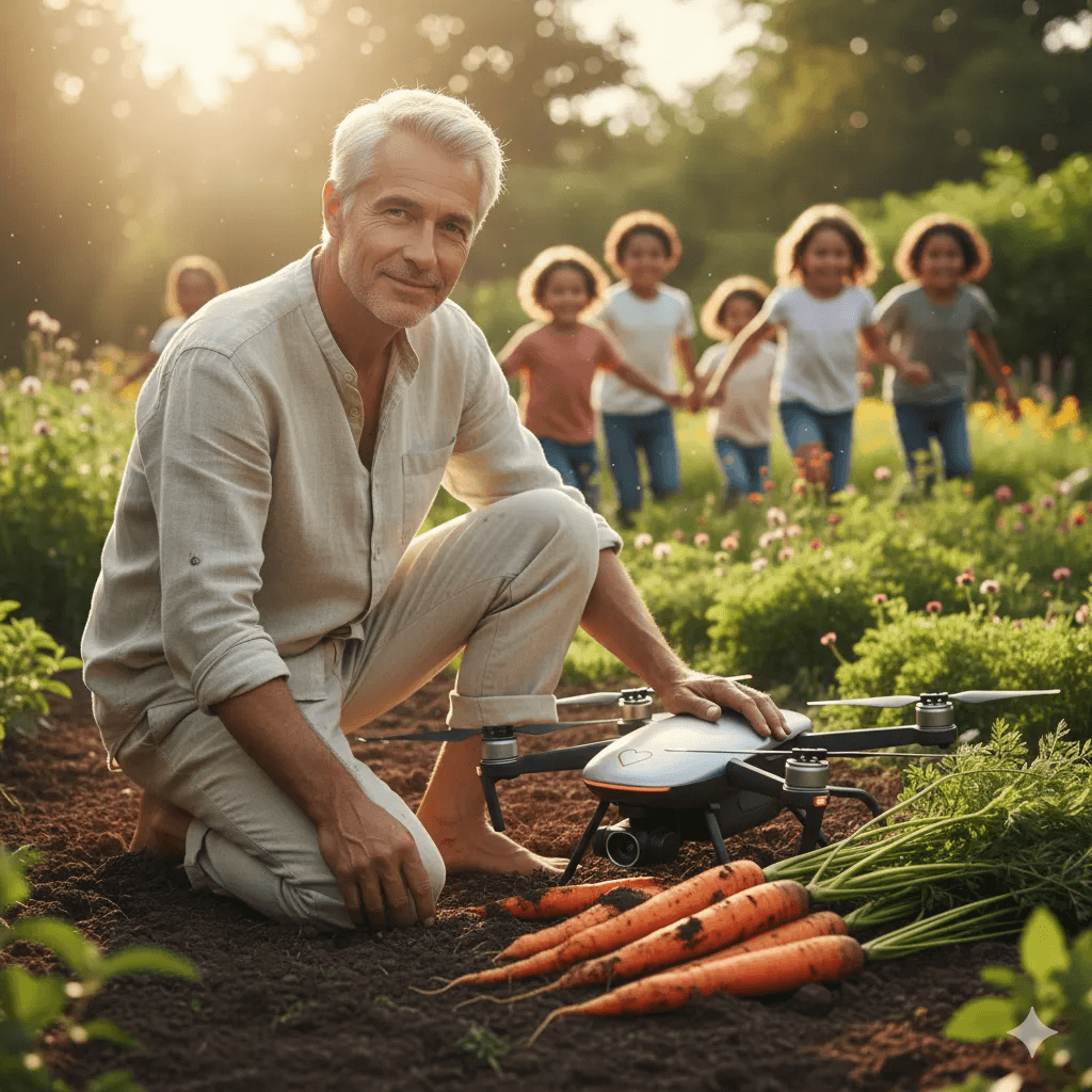Deep in the living jungle of 2056, Novak walks barefoot as the forest itself becomes both classroom and teacher. Every seed is a prayer. Every hand a renewal. Here, there are no fences, no rectangular fields — only a breathing ecosystem where mushrooms rise from fallen logs, vines heavy with beans spiral up trees, and small drones move like silver bees, mapping, pollinating, learning.