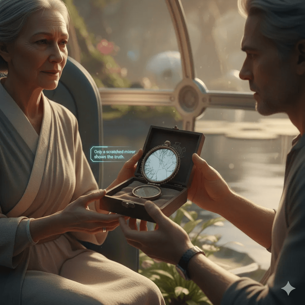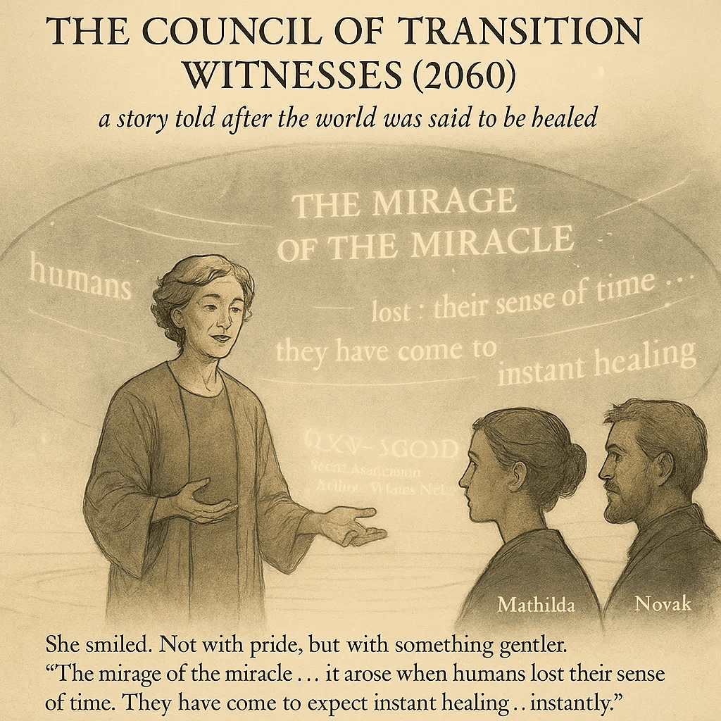 Hakan Ozan’s eighteenth archive entry is a warm, wise, and deeply philosophical story told in the ancient Anatolian meddah tradition. Through the voices of Novak, Mira, and the Council of Transition Witnesses, we discover how the new world was not “fixed” by a miracle — but by remembering the old ledgers, listening to the silence, and learning to live with the scratch in the mirror.