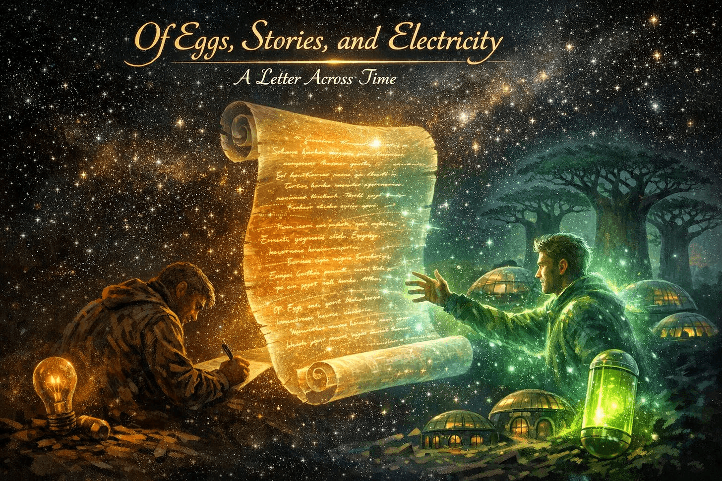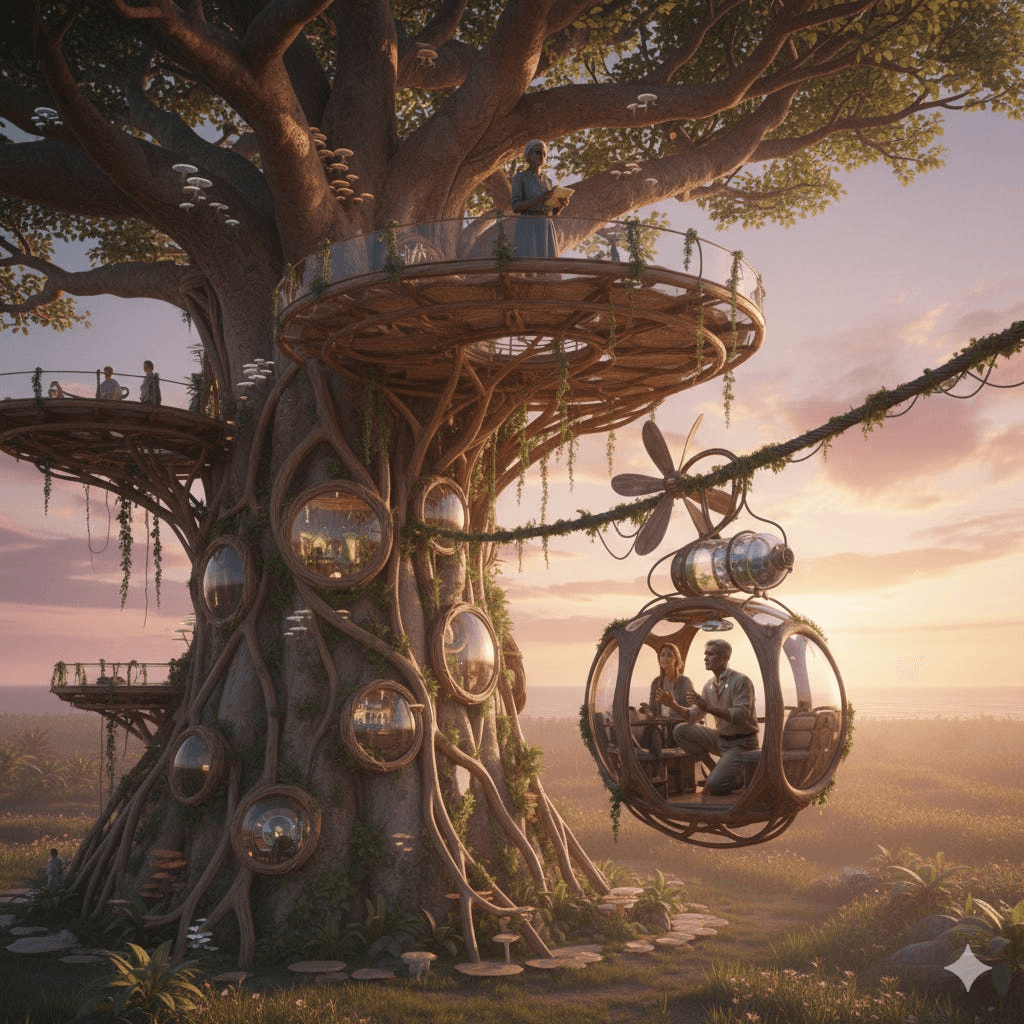 Image: Use the futuristic tree house or glowing orb village scene. It captures the intimate, hopeful atmosphere perfectly.