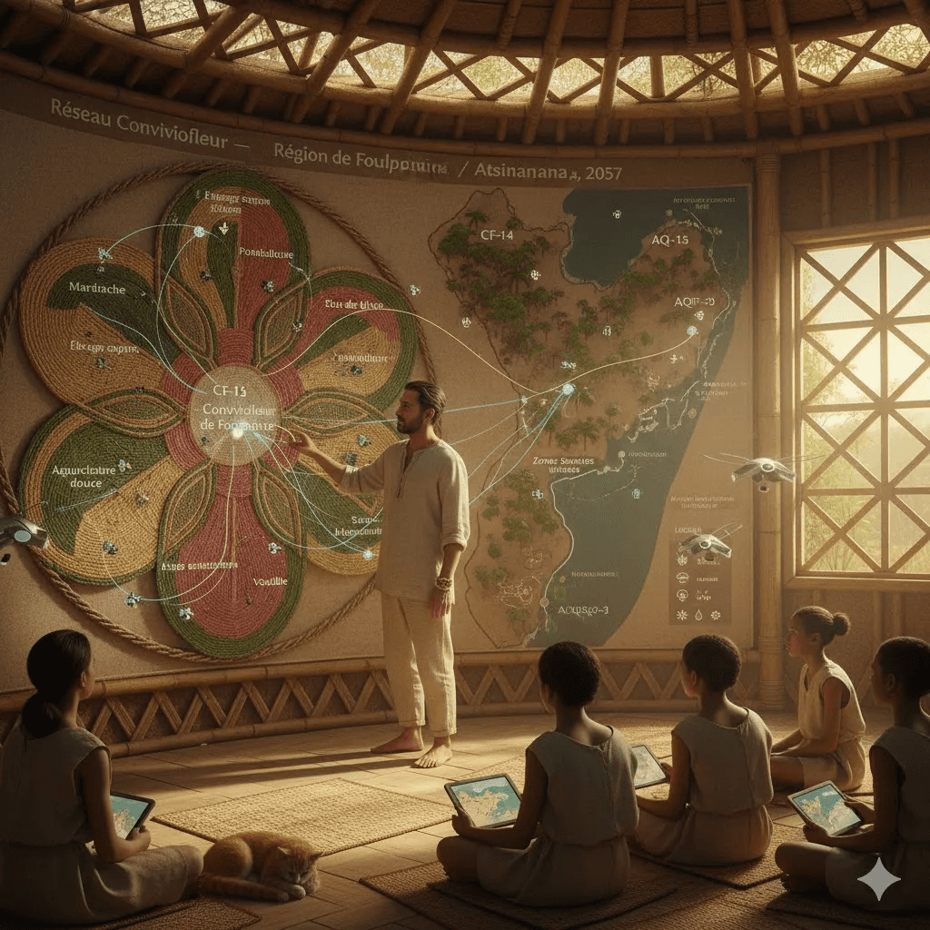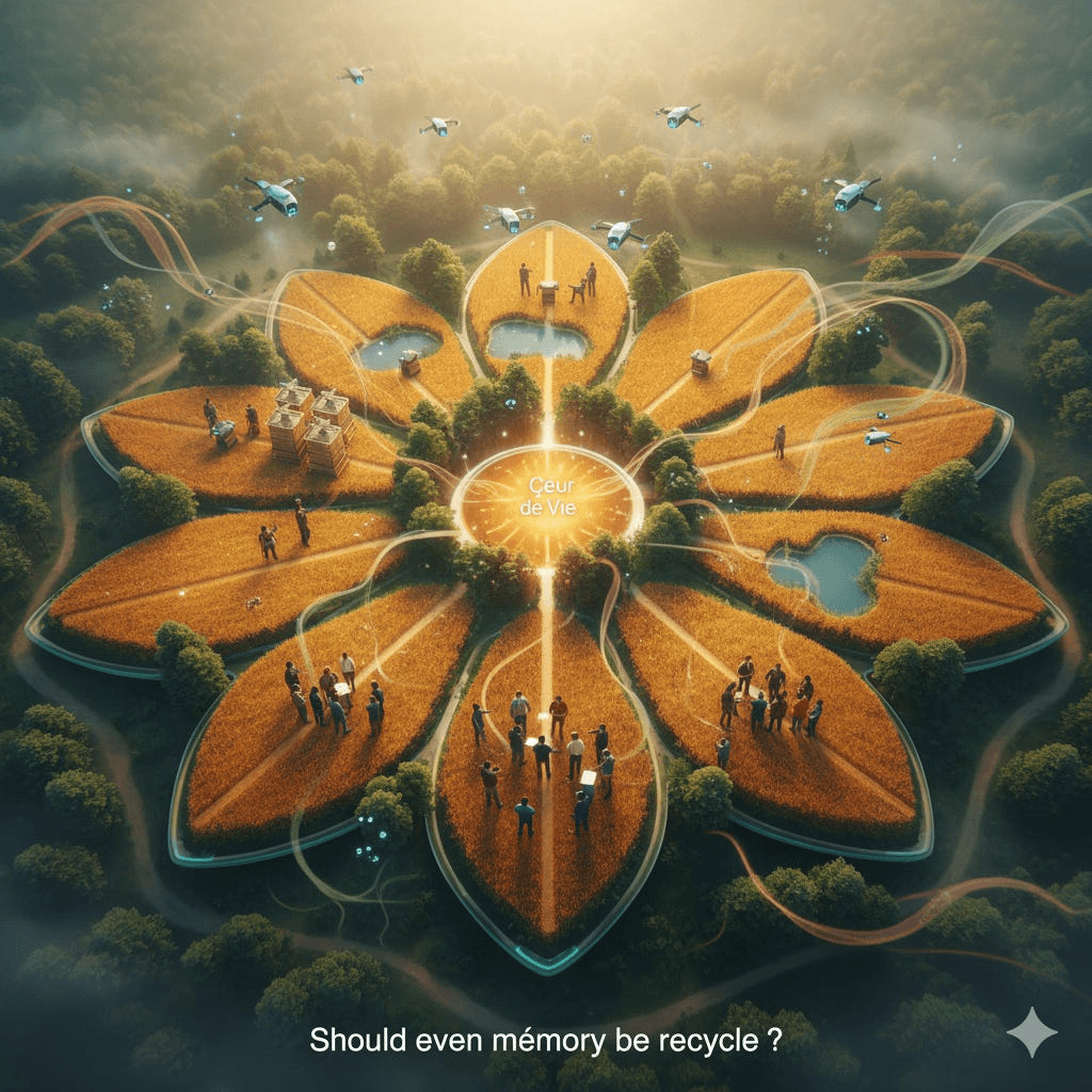 Hakan Ozan’s eleventh archive entry is a gentle, meditative walk through Conviviofleur-13 — where Novak discovers that the new civilization isn’t built on noise or factories, but on rhythm, silence, and mutual care. Through circular classrooms, living maps, and the simple act of roasting carrots together, he learns that true healing smells like earth and tastes like shared sweetness.
