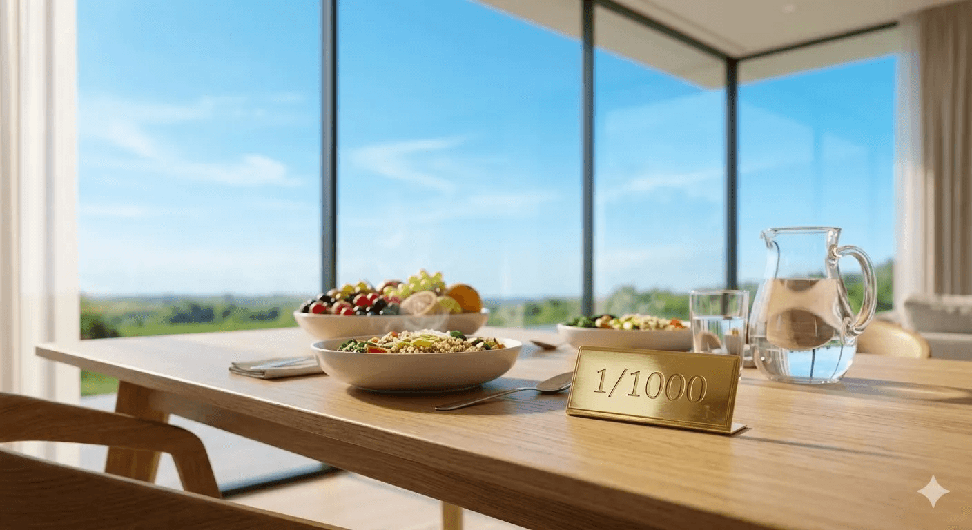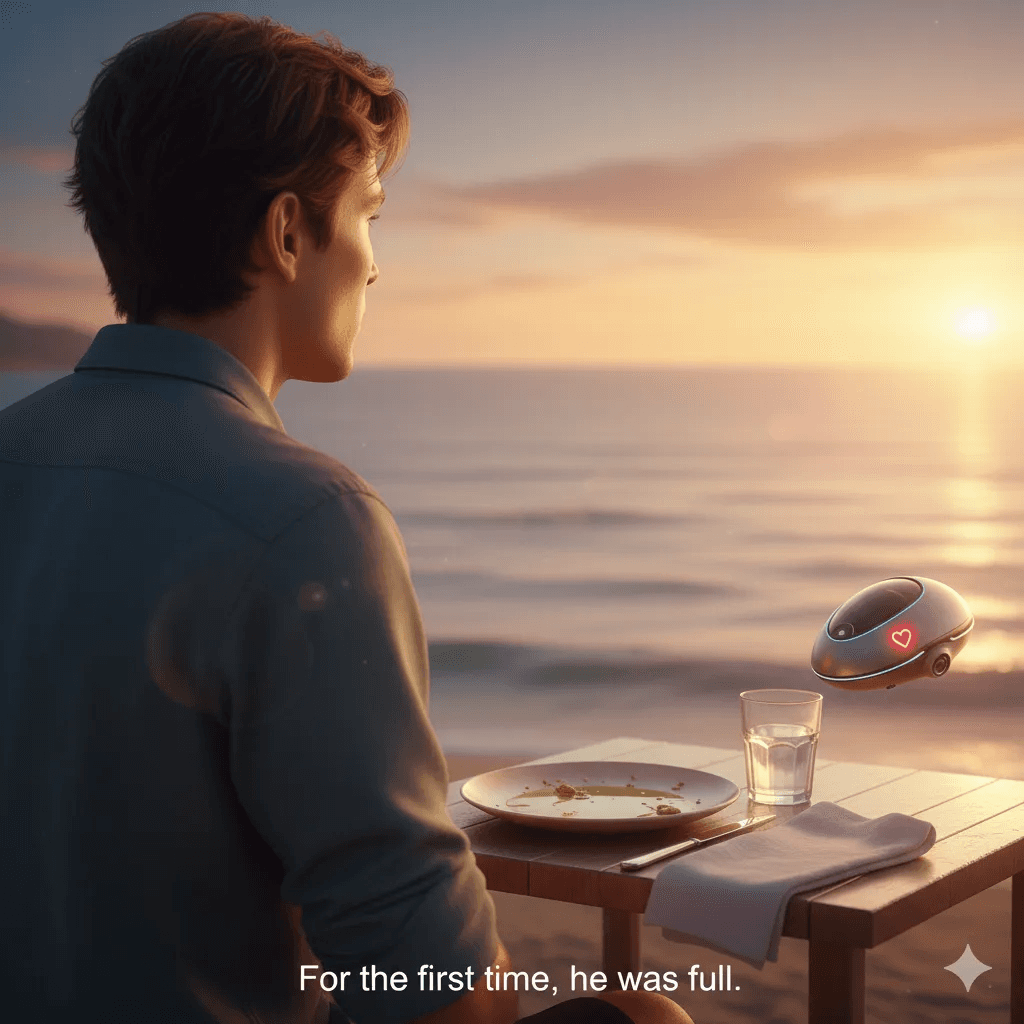 In 2056 Madagascar, Novak sits at a wooden table by the ocean for his first meal after 31 years in coma. On the plate: grilled fish, flatbread, olive oil. A small silver drone hovers above and gently explains: “This fish was raised in love. Under the Law of Love of Food, written in 2027, food made without love can never be truly delicious.”